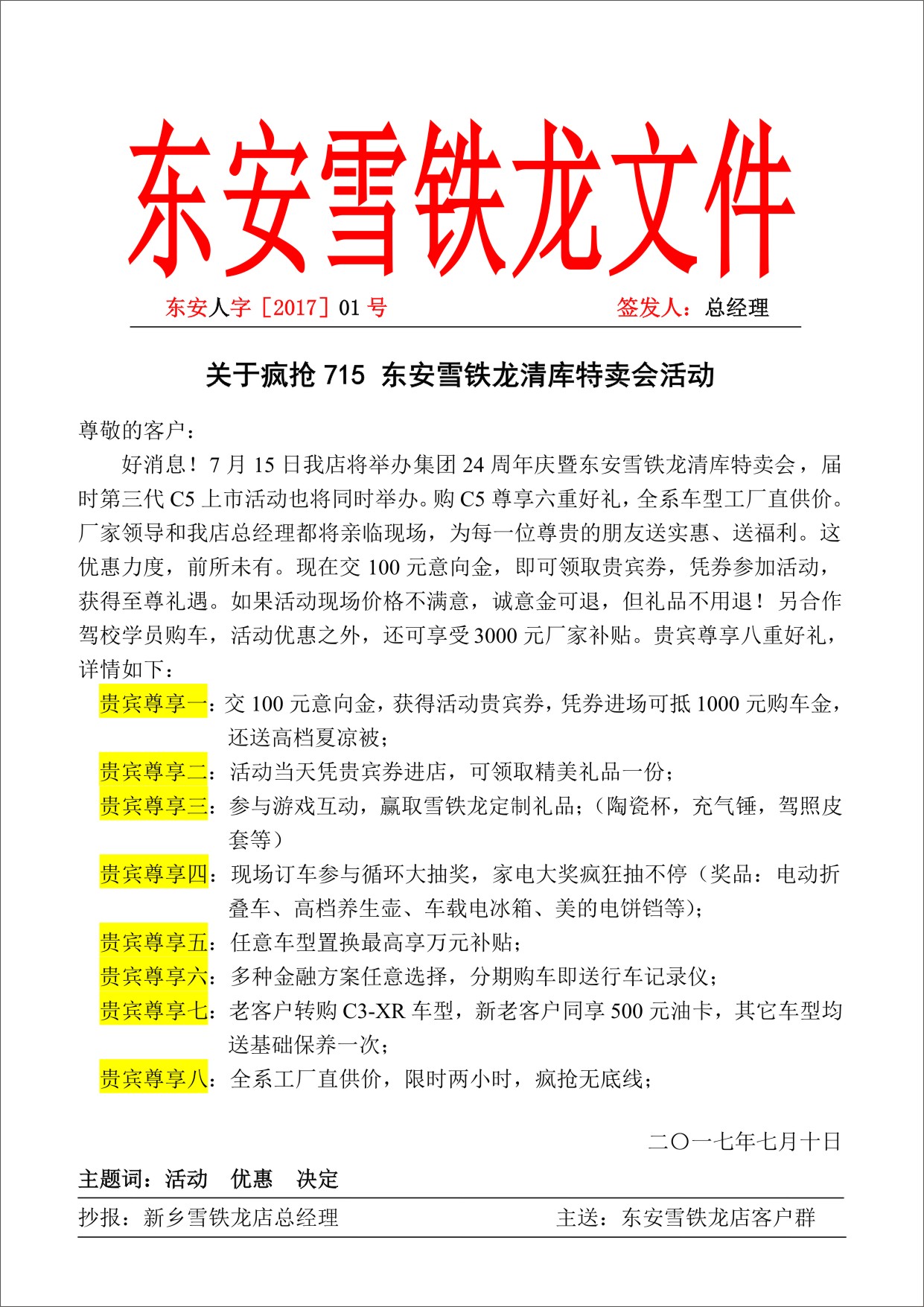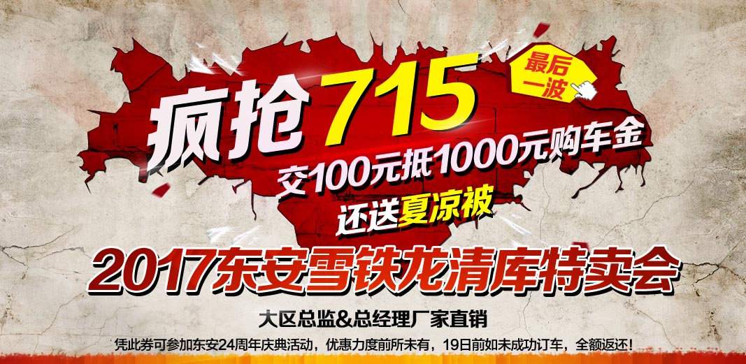 2017東安雪鐵龍年中冰點(diǎn)大促,大區(qū)總監(jiān)&總經(jīng)理廠家直銷,瘋搶715,交100元意向金抵1000元購車金,另外還送夏涼被,優(yōu)惠力度大,快來咨詢:3533111
