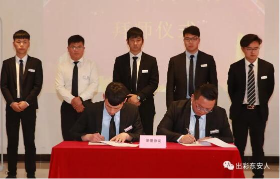 “師傅請喝茶!”新員工手捧茶杯,躬身拜向師傅。師傅接過茶杯,接受敬禮后,也向徒弟做出了鄭重承諾。